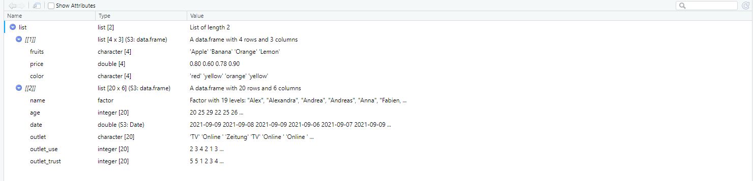 In this case, lists offer the most flexible way of saving very different objects within one object (i.e., the list). Let’s say that we want to save our data frame data_fruits as well the data frame survey in a single object. We do so by specifying a list which includes data_fruits as its first and survey as its second element: